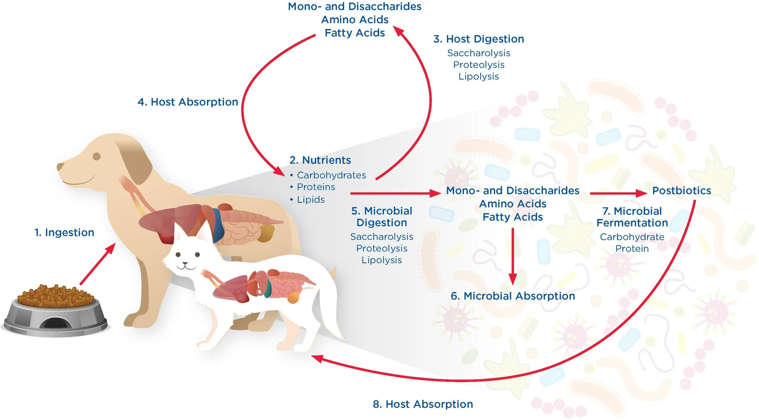 Postbiotics interact with the gut microbiome, immune system, and metabolic processes to support canine health. Here are the primary mechanisms: