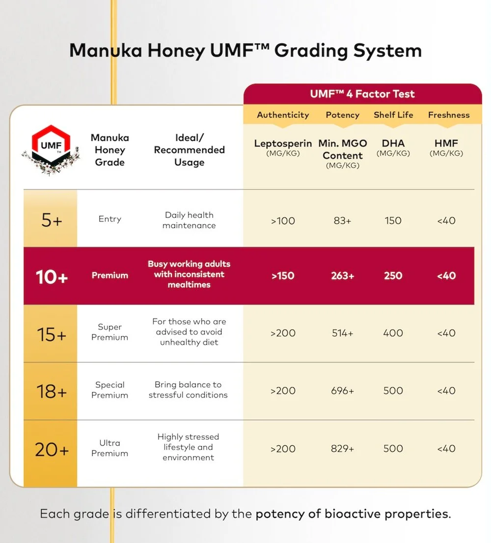• UMF 10+ or MGO 263+: Suitable for general wellness and minor issues.